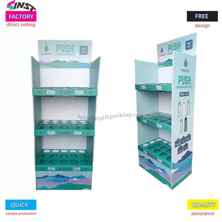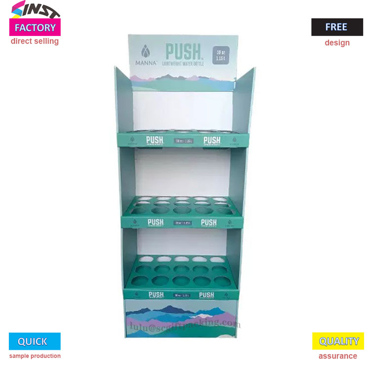 Tampilan lantai karton kardus ini dudukan untuk botol air Supermarke memiliki desain struktur kisi tiga lapis, dengan alur melingkar pada setiap lapisan untuk menahan botol air secara tepat dan mencegah bergulir. Logo merek dapat dicetak di bagian atas, dan grafik produk dapat dicetak di samping, sederhana dan kelas atas. Terutama digunakan untuk menampilkan produk seperti botol air, cangkir, gelas teh susu, gelas termos, dll.