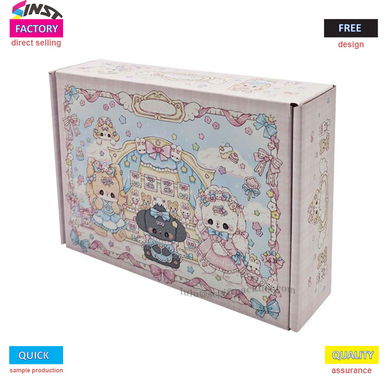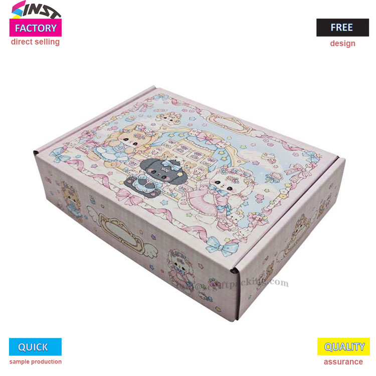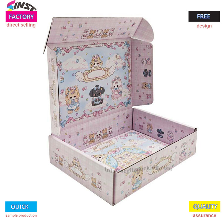 Kotak pesawat kertas bergelombang berwarna -warni untuk pakaian memiliki skema warna merah muda manis dengan aksen biru muda. Kotak ini dipenuhi dengan elemen kartun seperti karangan bunga bunga, binatang kecil, busur, awan, dan hati, menciptakan gaya yang melamun dan lucu. Dari penampilan ke layanan, ini sepenuhnya memberdayakan kemasan pakaian dan meningkatkan daya tarik merek.