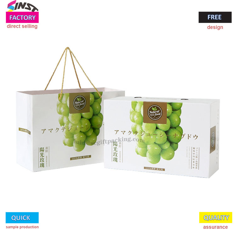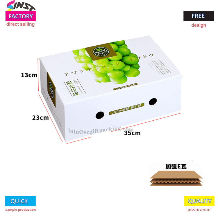 Kotak hadiah genggam universal buah untuk anggur terbuat dari bahan kardus yang dikorugasi e yang diperkuat, dengan pola anggur yang cerah dicetak di permukaan. Ini dipasangkan dengan tali pengangkut hijau di atas dan logo merek yang dicetak di box body, jelas menyampaikan filosofi layanan inti kami - tidak perlu perantara untuk membuat perbedaan harga, dan seluruh proses dari seleksi hingga produksi massal dikelola oleh pabrik.