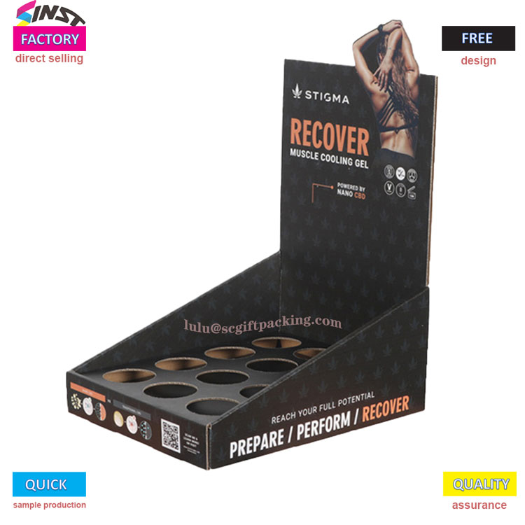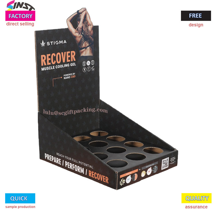 Kotak tampilan produk kesehatan ini dengan kertas ruang angkasa kosong menampilkan estetika minimalis dengan stamping panas latar belakang hitam dan efek visual yang kuat, menyoroti titik penjualan inti relaksasi otot setelah berolahraga. Rak layar mengadopsi desain penyimpanan lubang melingkar multi grid, yang tidak hanya menstabilkan tampilan tetapi juga melepaskan tekstur produk,